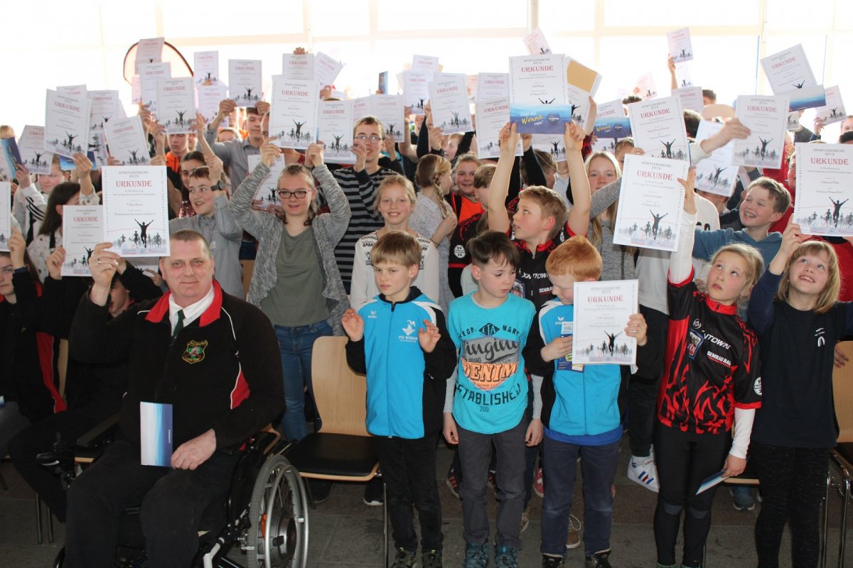 Aber auch unsere Jugend steht den erwachsenen Sportlern in nichts nach und so wurden im Foyer der Sport- und Mehrzweckhalle in Wismar über 200 Meistertitel auf der Jugendmeisterehrung ausgezeichnet. Aufgeregt und zapplig rutschten die Sportler auf ihren Stühlen hin und her während Paul Ennen, Vorsitzender der Sportjugend NWM, in seiner Ansprache den Trainingsfleiß der Kinder und Jugendlichen lobte. Zahlreiche Ehrengäste, wie Mario Löscher, Vorstand der Sparkassenstiftung, Beate Dellin, Fachdienstleiterin Jugend beim Landkreis NWM, Peter Fröhlich, stellv. Amtsleiter Hansestadt Wismar, Ramona Hedrich, 2. Vorsitzende des KreisSportBundes NWM, ließen es sich nicht nehmen, allen Siegern zu ihren Erfolgen zu gratulieren „Es ist schon bemerkenswert, wie viele Titel und Erfolge der Nachwuchs im Landkreis errungen hat und welch ein großartiges Engagement der Trainer dahinter steck“, so Mario Löscher, Vorstand der Sparkassenstiftung. Der Rehnaer SV, die DLRG Wismar und SV Blau Weiß Grevesmühlen wurden von Ute von Tilinsky, AOK Nordost, und Mario Löscher für ihre hervorragende Kinder- und Jugendarbeit 2018 mit einen Scheck und einer Urkunde ausgezeichnet.